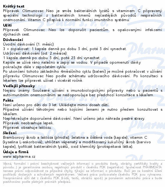 Přípravek Olimunovac Neo je směs bakteriálních lyzátů s vitaminem C připravený speciální technologií z bakteriálních kmenů nejčastějších původců respiračních onemocnění. Vitamin C přispívá k normální funkci imunitního systému.
