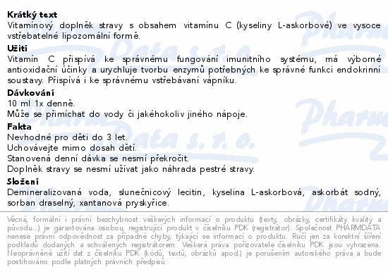 Vitamínový doplněk stravy s obsahem vitamínu C (kyseliny L-askorbové) ve vysoce vstřebatelné lipozomální formě.
