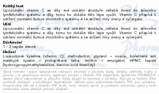 Lipozomální vitamín C se díky své unikátní struktuře vstřebá ihned do střevního lymfatického systému a díky tomu ho dokáže tělo lépe využít. Vitamin C přispívá k udržení normální funkce imunitního systému a ke snížení míry únavy a vyčerpání.