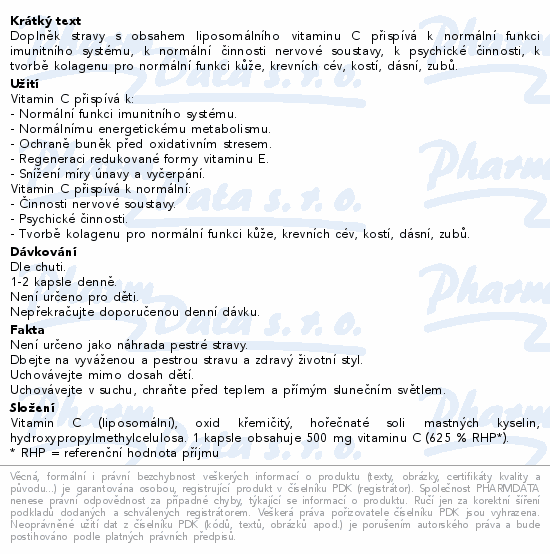 Doplněk stravy s obsahem liposomálního vitaminu C přispívá k normální funkci imunitního systému, k normální činnosti nervové soustavy, k psychické činnosti, k tvorbě kolagenu pro normální funkci kůže, krevních cév, kostí, dásní, zubů.