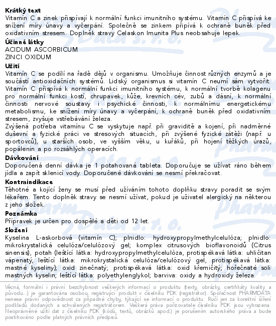 Vitamín C a zinek přispívají k normální funkci imunitního systému. Vitamín C přispívá ke snížení míry únavy a vyčerpání. Společně se zinkem připívá k ochraně buněk před oxidativním stresem. Doplněk stravy Celaskon Imunita Plus neobsahuje lepek.