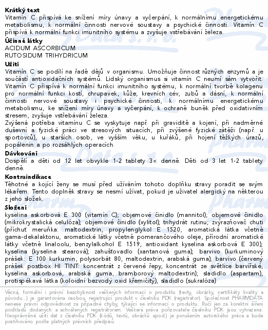 Vitamín C přispívá ke snížení míry únavy a vyčerpání, k normálnímu energetickému metabolismu, k normální činnosti nervové soustavy a psychické činnosti. Vitamín C přispívá k normální funkci imunitního systému a zvyšuje vstřebávání železa.