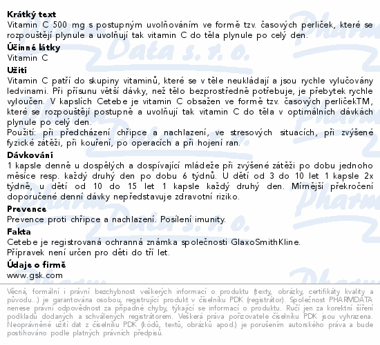 Vitamin C 500 mg s postupným uvolňováním ve formě tzv. časových perliček, které se rozpouštějí plynule a uvolňují tak vitamin C do těla plynule po celý den.