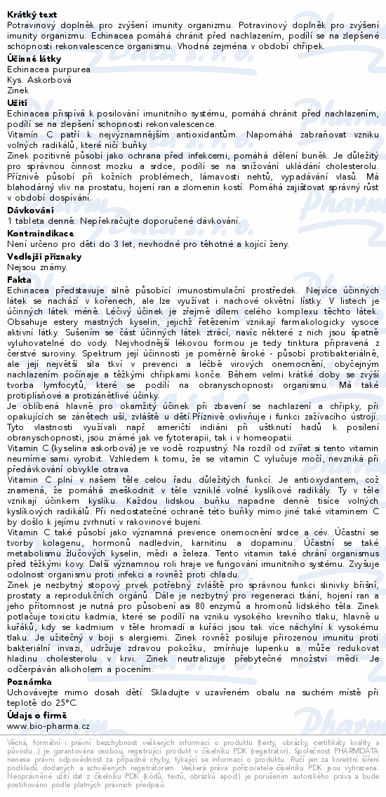 Potravinový doplněk pro zvýšení imunity organizmu. Potravinový doplněk pro zvýšení imunity organizmu. Echinacea pomáhá chránit před nachlazením, podílí se na zlepšené schopnosti rekonvalescence organismu. Vhodná zejména v období chřipek.