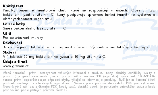 Pastilky příjemné mentolové chuti, které se rozpouštějí v ústech. Obsahují tzv. bakteriální lyzát a vitamin C, který podporuje správnou funkci imunitního systému a obranyschopnost organismu.