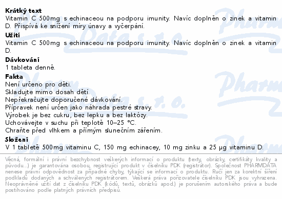 Vitamin C 500mg s echinaceou na podporu imunity. Navíc doplněn o zinek a vitamin D. Přispívá ke snížení míry únavy a vyčerpání.