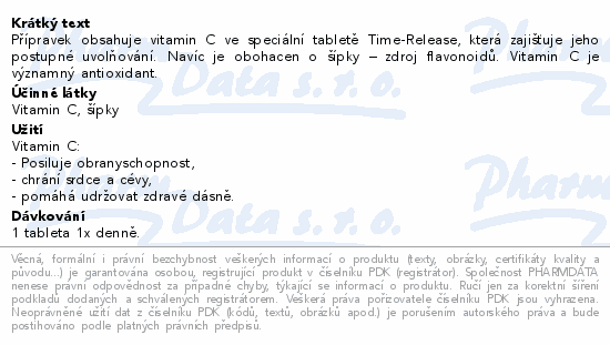 Přípravek obsahuje vitamin C ve speciální tabletě Time-Release, která zajišťuje jeho postupné uvolňování. Navíc je obohacen o šípky – zdroj flavonoidů. Vitamin C je významný antioxidant.