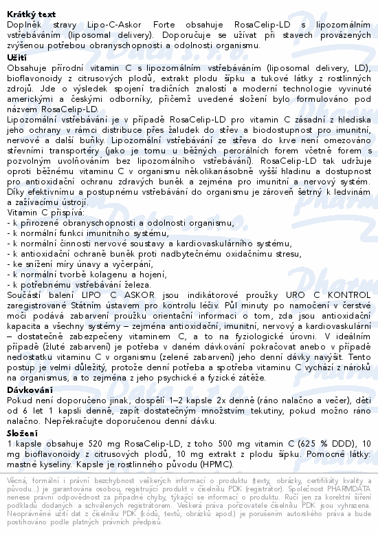 Doplněk stravy Lipo-C-Askor Forte obsahuje RosaCelip-LD s lipozomálním vstřebáváním (liposomal delivery). Doporučuje se užívat při stavech provázených zvýšenou potřebou obranyschopnosti a odolnosti organismu.