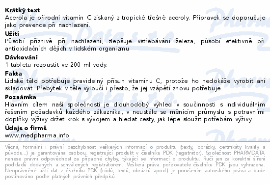 Acerola je přírodní vitamín C získaný z tropické třešně aceroly. Přípravek se doporučuje jako prevence při nachlazení.