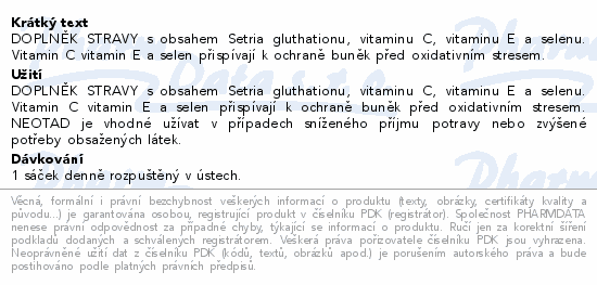 DOPLNĚK STRAVY s obsahem Setria gluthationu, vitaminu C, vitaminu E a selenu. Vitamin C vitamin E a selen přispívají k ochraně buněk před oxidativním stresem.
