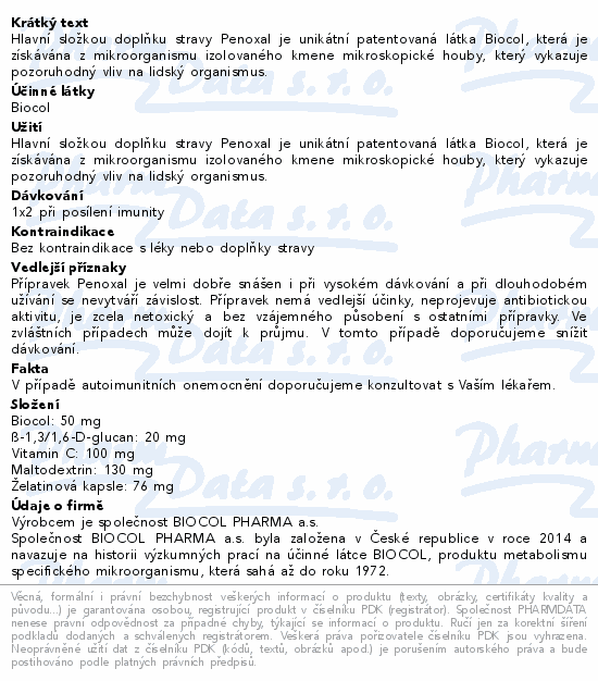 Hlavní složkou doplňku stravy Penoxal je unikátní patentovaná látka Biocol, která je získávána z mikroorganismu izolovaného kmene mikroskopické houby, který vykazuje pozoruhodný vliv na lidský organismus.