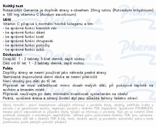 Rutascorbit Generica je doplněk stravy s obsahem 20mg rutinu (Rutosidum trihydricum) a 100 mg vitaminu C (Acidum ascorbicum).