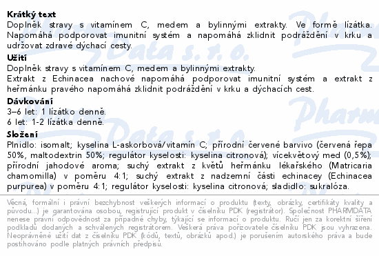Doplněk stravy s vitamínem C, medem a bylinnými extrakty. Ve formě lízátka. Napomáhá podporovat imunitní systém a napomáhá zklidnit podráždění v krku a udržovat zdravé dýchací cesty.