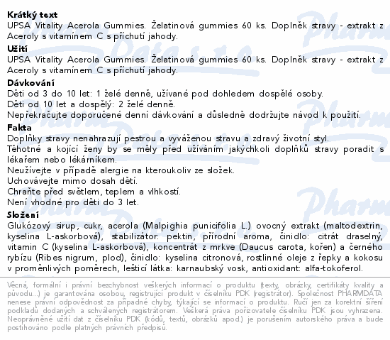UPSA Vitality Acerola Gummies. Želatinová gummies 60 ks. Doplněk stravy - extrakt z Aceroly s vitamínem C s příchutí jahody.