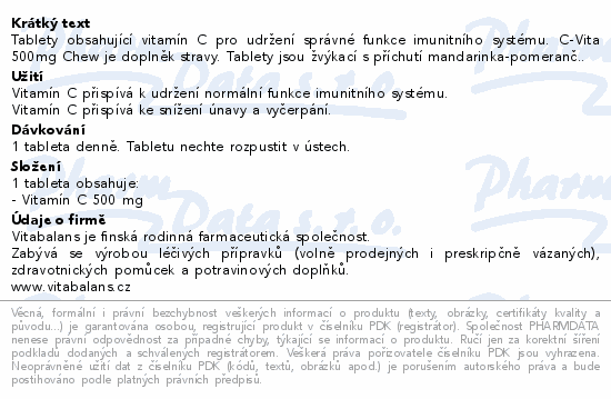 Tablety obsahující vitamín C pro udržení správné funkce imunitního systému. C-Vita 500mg Chew je doplněk stravy. Tablety jsou žvýkací s příchutí mandarinka-pomeranč..