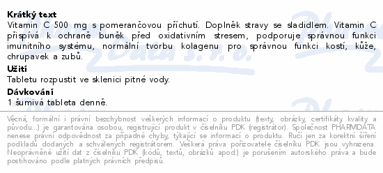 Vitamin C 500 mg s pomerančovou příchutí. Doplněk stravy se sladidlem. Vitamin C přispívá k ochraně buněk před oxidativním stresem, podporuje správnou funkci imunitního systému, normální tvorbu kolagenu pro správnou funkci kostí, kůže, chrupavek a zubů.