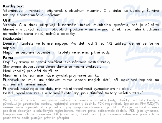 Vitaminovo – minerální přípravek s obsahem vitaminu C a zinku, se sladidly. Šumivé tablety s pomerančovou příchutí.