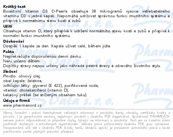 Bioaktivní Vitamin D3 D-Pearls obsahuje 38 mikrogramů vysoce vstřebatelného vitaminu D3 v jedné kapsli. Pomáhá udržovat správnou funkci imunitního systému a normální stav kostí a zubů.