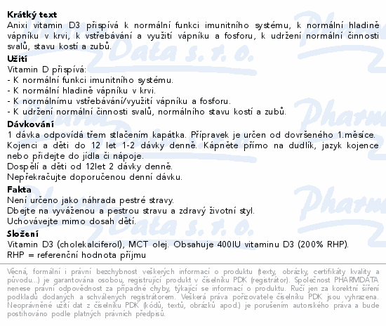 Anixi vitamin D3 přispívá k normální funkci imunitního systému, k normální hladině vápníku v krvi, k vstřebávání a využití vápníku a fosforu, k udržení normální činnosti svalů, stavu kostí a zubů.