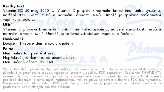 Vitamin D3 50 mcg 2000 IU. Vitamin D přispívá k normální funkci imunitního systému, udržení stavu kostí, zubů a normální činnosti svalů. Umožňuje správné vstřebávání vápníku a fosforu.