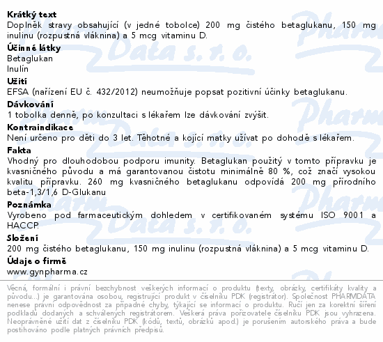 Betaglukan IMU 200 mg je doplněk stravy s betaglukanem získaným moderní technologií, která zaručuje jeho maximální aktivitu. Je obohacen o vitamin D, který přispívá k normální funkci imunitního systému, a také o inulin, prebiotickou vlákninu.