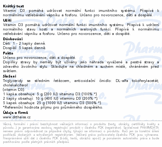Vitamin D3 pomáhá udržovat normální funkci imunitního systému. Přispívá k normálnímu vstřebávání vápníku a fosforu. Určeno pro novorozence, děti a dospělé.