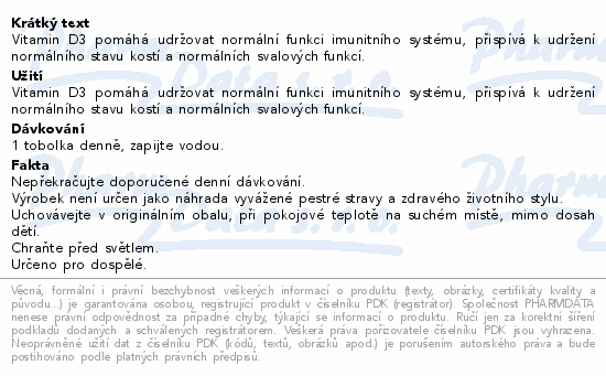 Vitamin D3 pomáhá udržovat normální funkci imunitního systému, přispívá k udržení normálního stavu kostí a normálních svalových funkcí.
