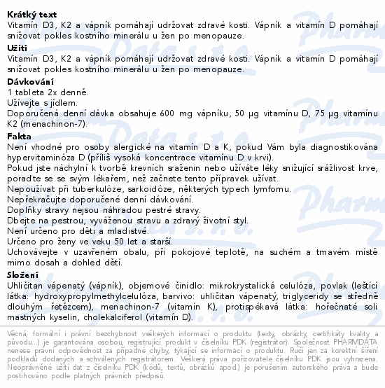 Vitamín D3, K2 a vápník pomáhají udržovat zdravé kosti. Vápník a vitamín D pomáhají snižovat pokles kostního minerálu u žen po menopauze.