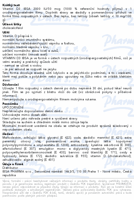 Vitamin D3 IBSA 2000 IU/50 mcg (1000 % referenční hodnoty příjmu) v 1 orodispergovatelném filmu. Doplněk stravy se sladidly s pomerančovou příchutí ve formě filmů rozpustných v ústech. Bez lepku, bez laktózy (obsah laktózy < 10 mg/100 g).