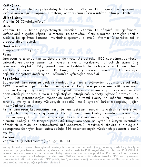 Vitamín D3 v lehce polykatelných kapslích. Vitamín D přispívá ke správnému vstřebávání a využití vápníku a fosforu, ke zdravému růstu a udržení zdravých kostí.
