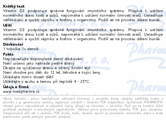 Vitamin D3 podporuje správné fungování imunitního systému. Přispívá k udržení normálního stavu kostí a zubů, napomáhá k udržení normální činnosti svalů. Usnadňuje vstřebávání a využití vápníku a fosforu v organizmu. Podílí se na procesu dělení buněk.