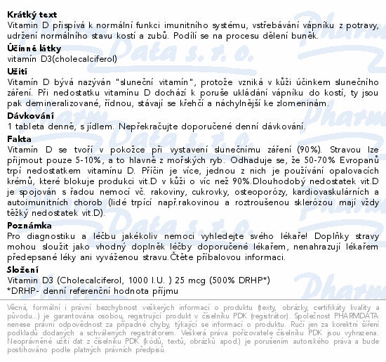 Vitamin D přispívá k normální funkci imunitního systému, vstřebávání vápníku z potravy, udržení normálního stavu kostí a zubů. Podílí se na procesu dělení buněk.
