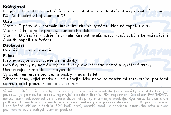 Oligovit D3 2000 IU měkké želatinové tobolky jsou doplněk stravy obsahující vitamín D3. Dodatečný zdroj vitamínu D3.