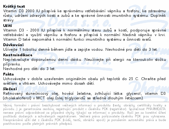 Vitamin D3 2000 IU přispívá ke správnému vstřebávání vápníku a fosforu, ke zdravému růstu, udržení zdravých kostí a zubů a ke správné činnosti imunitního systému. Doplněk stravy.