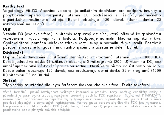 Vegetology Vit D3 Vitashine ve spreji je unikátním doplňkem pro podporu imunity a pohybového aparátu. Veganský vitamin D3 pocházející z lišejníků, jedinečného organického rostlinného zdroje. Balení obsahuje 150 dávek (denní dávku 25 mikrogramů na 30 dní)
