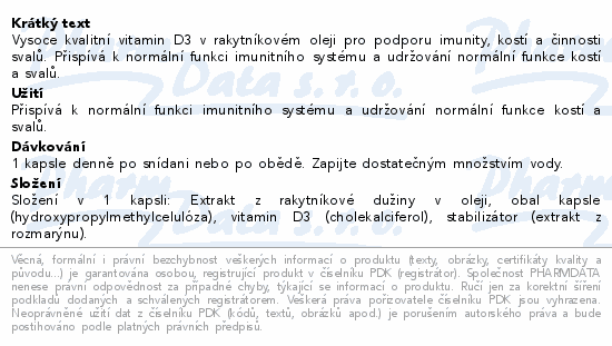 Vysoce kvalitní vitamin D3 v rakytníkovém oleji pro podporu imunity, kostí a činnosti svalů. Přispívá k normální funkci imunitního systému a udržování normální funkce kostí a svalů.
