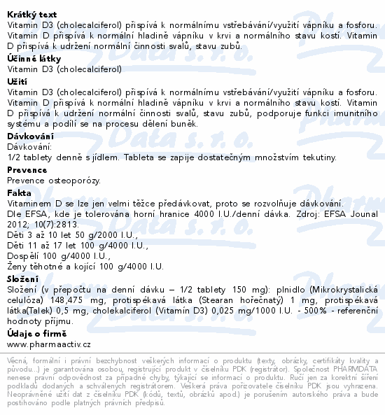 Vitamin D3 (cholecalciferol) přispívá k normálnímu vstřebávání/využití vápníku a fosforu. Vitamin D přispívá k normální hladině vápníku v krvi a normálního stavu kostí. Vitamin D přispívá k udržení normální činnosti svalů, stavu zubů.