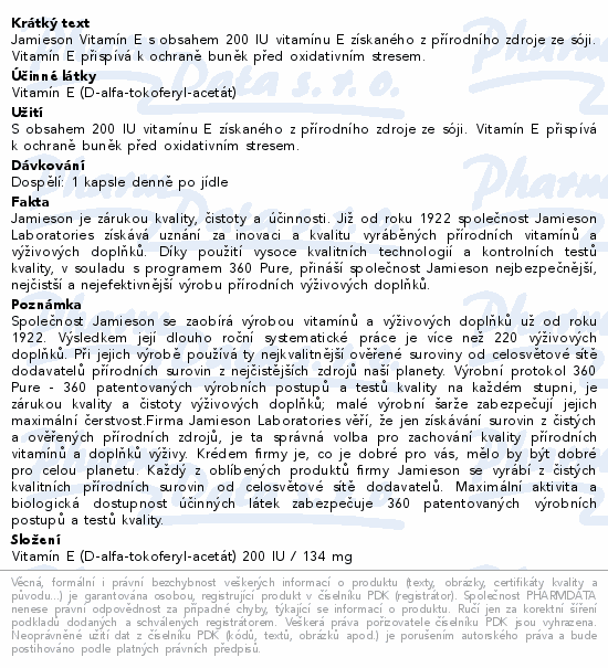 Jamieson Vitamín E s obsahem 200 IU vitamínu E získaného z přírodního zdroje ze sóji. Vitamín E přispívá k ochraně buněk před oxidativním stresem.