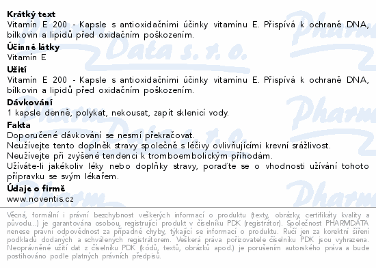 VITAMÍN E 200 - Kapsle s antioxidačními účinky vitamínu E.Vitamín E přispívá k ochraně DNA, bílkovin a lipidů před oxidačním poškozením.