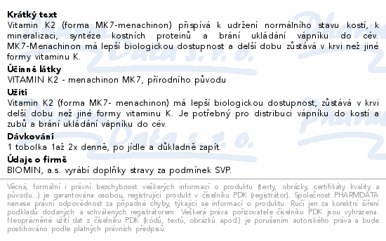 Biomin Vitamin K2 (forma MK7-menachinon) je doplněk stravy, který pomáhá udržovat zdravé kosti a kardiovaskulární systém. Díky němu se vápník vstřebává přímo do kostí a zubů, kde je potřebný a neukládá se tak v cévách a tkáních. Ve formě MK7-Menachinon má navíc lepší biologickou dostupnost a delší dobu zůstává v krvi než jiné formy vitaminu K.