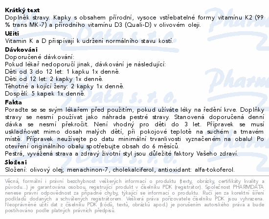 Doplněk stravy. Kapky s obsahem přírodní, vysoce vstřebatelné formy vitamínu K2 (99 % trans MK-7) a přírodního vitamínu D3 (Quali-D) v olivovém oleji.