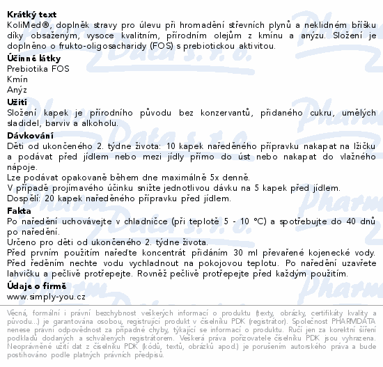 KoliMed®, doplněk stravy pro úlevu při hromadění střevních plynů a neklidném bříšku díky obsaženým, vysoce kvalitním, přírodním olejům z kmínu a anýzu. Složení je doplněno o frukto-oligosacharidy (FOS) s prebiotickou aktivitou.