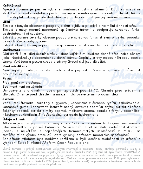 Apetister Junior je pečlivě vybraná kombinace bylin a vitamínů. Doplněk stravy ve formě sirupu s příchutí maliny a černého rybízu pro děti od 3 let. Forma sirupu je obzvlášť vhodná pro děti od 3 let pro její snadné užívání.