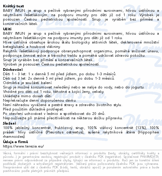 BABY IMUN je sirup s pečlivě vybranými přírodními surovinami, hlívou ústřičnou a rakytníkem řešetlákovým, na podporu imunity pro děti již od 1 roku. Výrobek je posouzen Českou pediatrickou společností. Sirup je vyráběn bez příměsí a konzervačních látek.