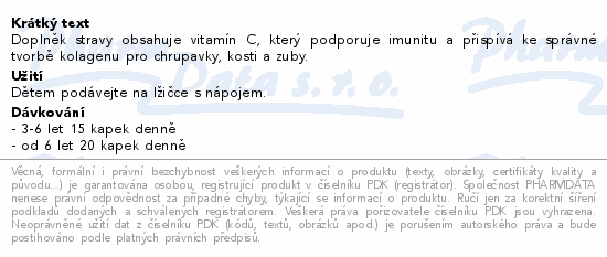 Doplněk stravy obsahuje vitamín C, který podporuje imunitu a přispívá ke správné tvorbě kolagenu pro chrupavky, kosti a zuby.