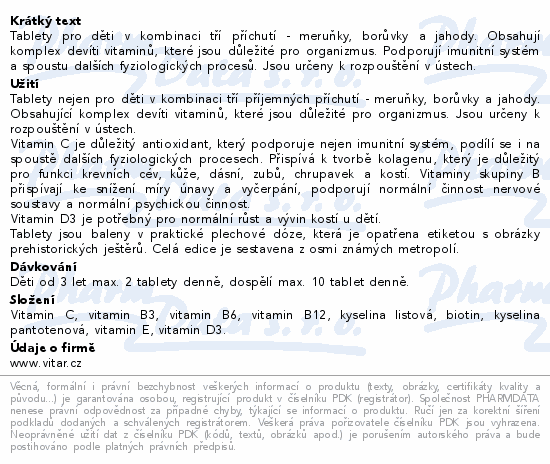 Tablety pro děti v kombinaci tří příchutí - meruňky, borůvky a jahody. Obsahují komplex devíti vitaminů, které jsou důležité pro organizmus. Podporují imunitní systém a spoustu dalších fyziologických procesů. Jsou určeny k rozpouštění v ústech.