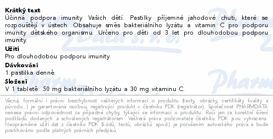Účinná podpora imunity Vašich dětí. Pastilky příjemné jahodové chuti, které se rozpouštějí v ústech. Obsahuje směs bakteriálního lyzátu a vitamin C pro podporu imunity dětského organismu. Určeno pro děti od 3 let pro dlouhodobou podporu imunity.