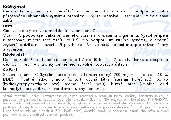 Cucavé tablety ve tvaru medvídků s vitaminem C. Vitamin C podporuje funkci přirozeného obranného systému organismu. Xylitol přispívá k zachování mineralizace zubů.