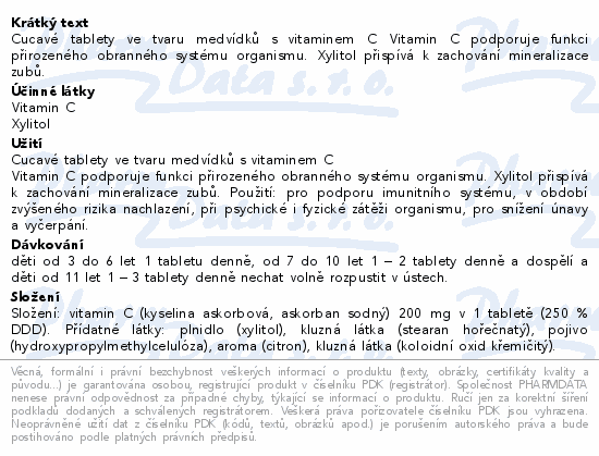 Cucavé tablety ve tvaru medvídků s vitaminem C Vitamin C podporuje funkci přirozeného obranného systému organismu. Xylitol přispívá k zachování mineralizace zubů.
