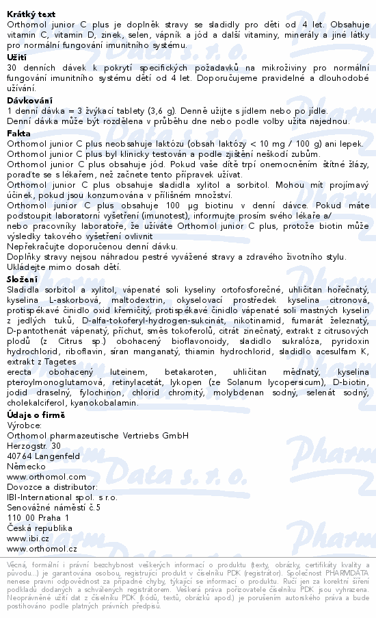 Orthomol junior C plus je doplněk stravy pro děti s cukry a sladidly. S vitaminem C, vitaminem D a selenem. Obsahuje zinek, který přispívá k normální funkci imunitního systému. S vápníkem a vitaminem D, s jódem. Pro děti od 4 let.